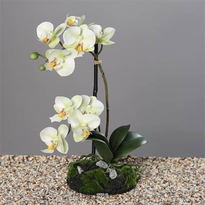 Orchidee artificielle 2 hampes sur motte H 33 cm 9 fleurons tissu Blanc-vert